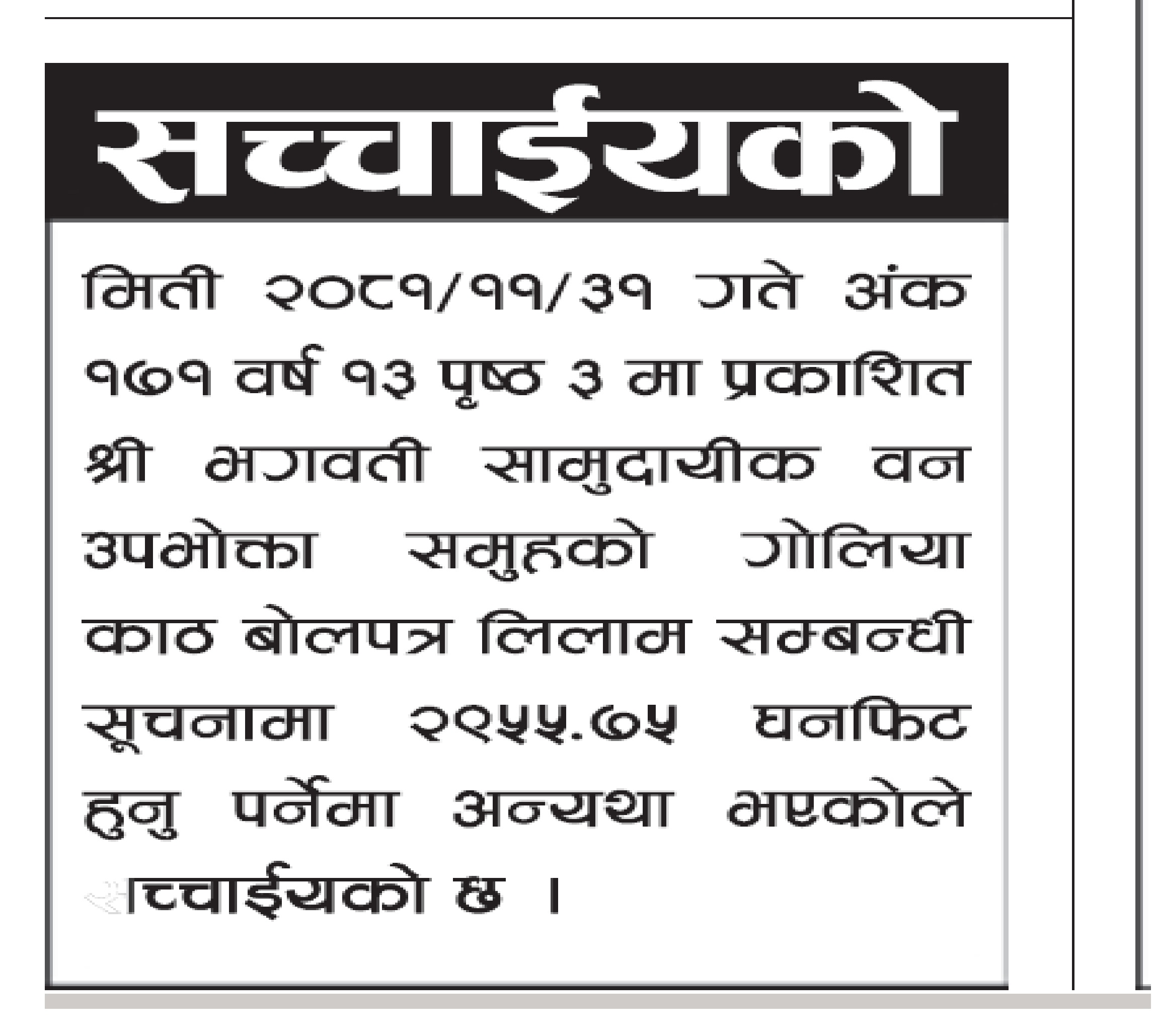 Oct. 13, 2025 गोलिया काठ, दाउरा बोलपत्रद्बारा लिलाम विक्रीको सूचना (शान्ति सा.व.उ.स, दाङ) २०८२।०६।२५