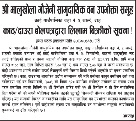 भदौ १४, २०८२ काठ/दाउरा बोलपत्रद्वारा लिलाम विक्रीको सूचना (अजम्बरी सावउस, दाङ) २०८२।०५।०५