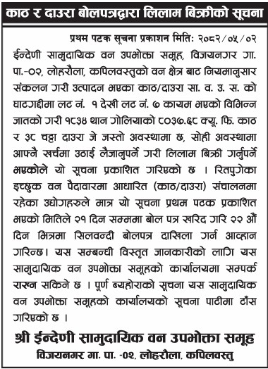 भदौ १४, २०८२ काठ र दाउरा बोलपत्रद्वारा लिलाम विक्रीको सूचना (इन्द्रेणी सावउस, कपिलवस्तु) २०८२।०५।०२