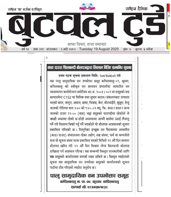 भदौ १४, २०८२ काठ दाउरा शिलवन्दी बोलपत्रद्वारा लिलाम विक्री सम्बन्धी सूचना (पालु सावउस, कपिलवस्तु) २०८२।०५।०३